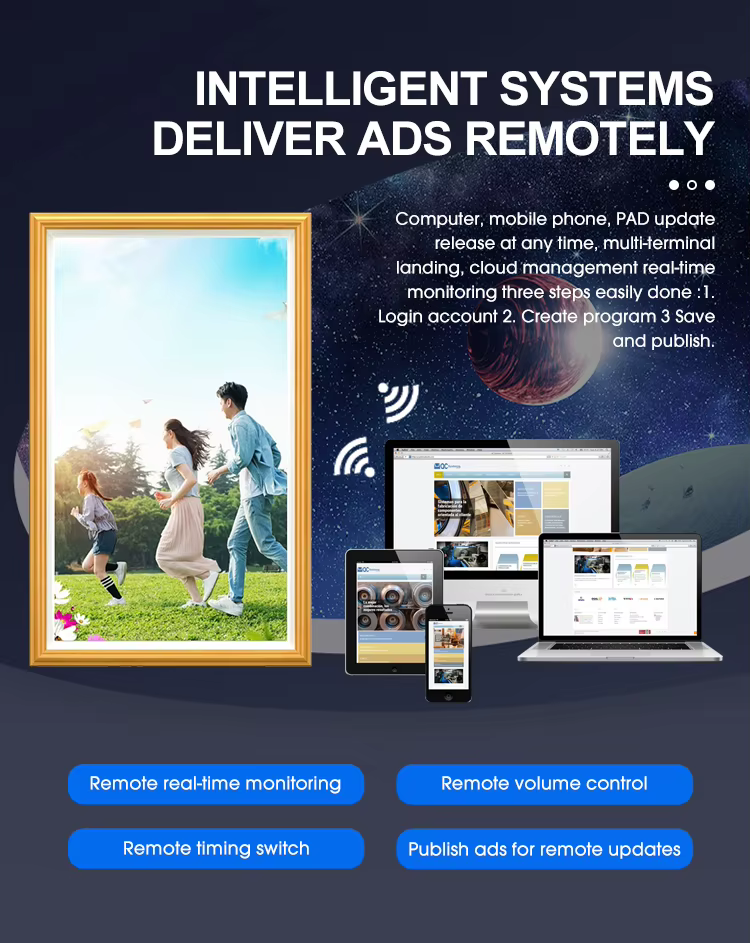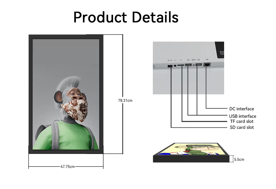 3.Simple Design: Erittäin ohut LCD-mainoskoneen kuori karkaistu lasinsuojalla, niin että nestekidenäyttö ei ole vaurioitunut,
